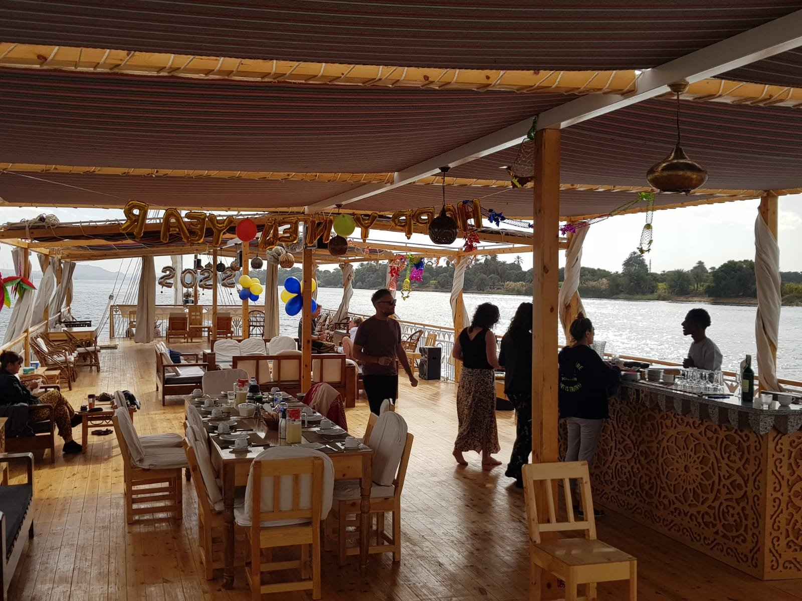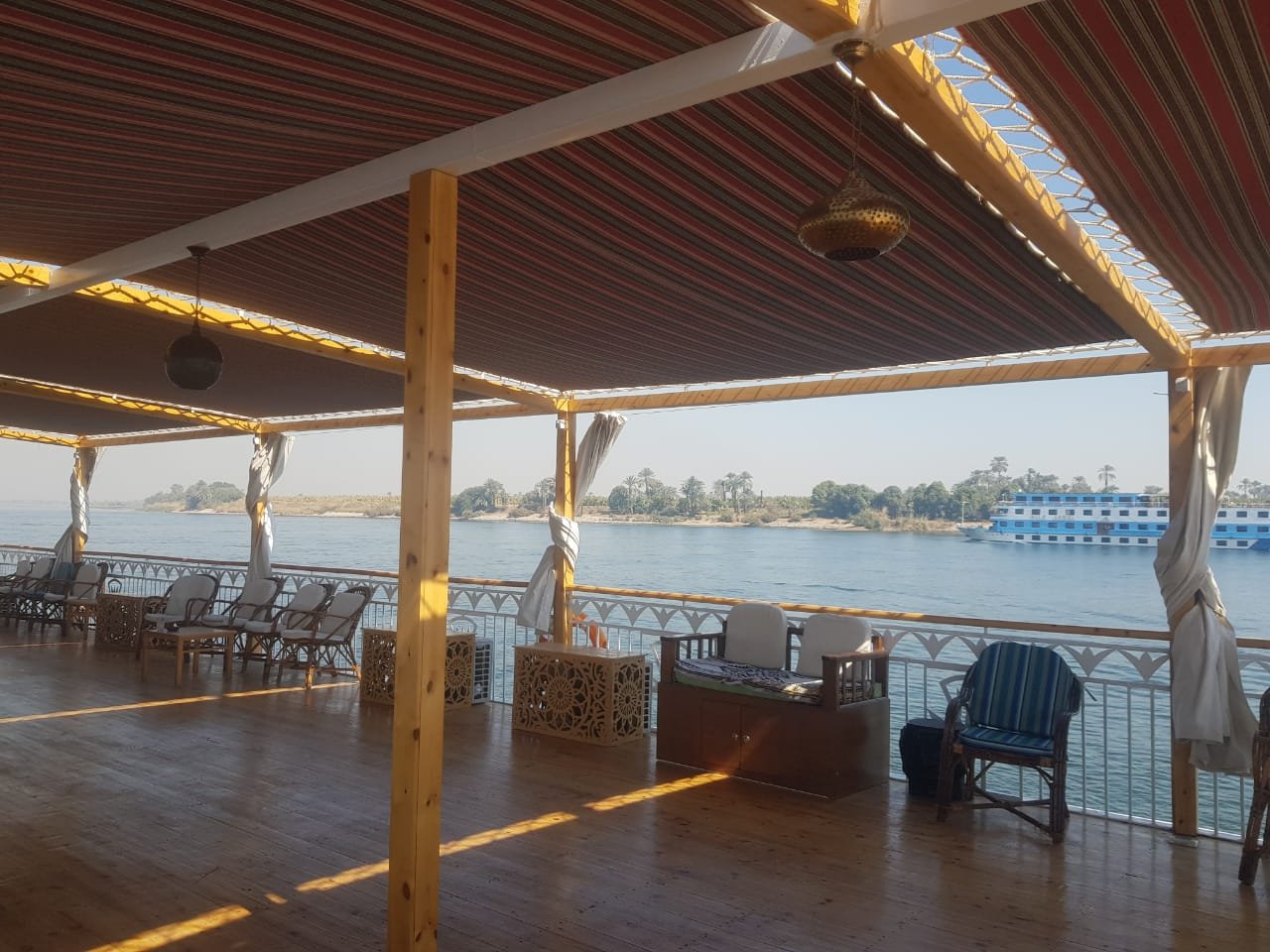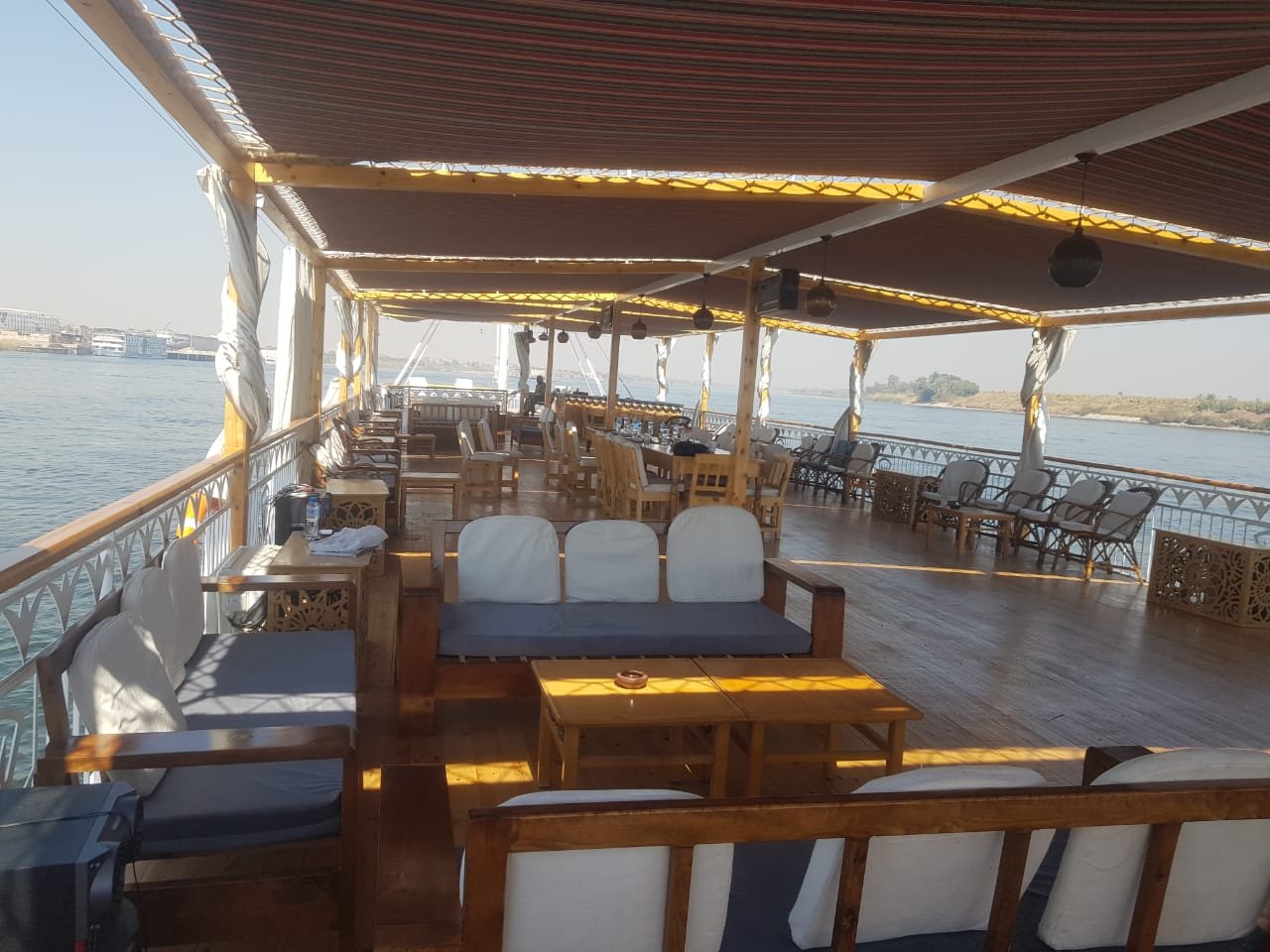 Each one of the eight cabins is roomy at 3.5 X 3.5 square meters. Individually decorated with local antiques, every cabin has two large antique beds dressed up with fine Egyptian cotton. Two large windows which offer views of ancient sites, riverside villages, and breathtaking scenery. Each of the air-conditioned cabins has a well-equipped bathroom with a bath, shower, toilet, and a beautifully tiled floor.